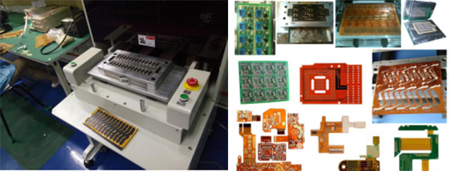 应用于:手机,数码像机,电子配件,电脑,汽车等的电路板批量模切,切割多联电路板时,能发挥最大效果。电子行业如手机板,内存卡,手机软线路,HDI(高密度印刷电路板)、FPCB(柔性电路板)和FCCL(柔性覆铜箔层压板)等分割。对于大批量通槽式PCB基板和软性线路板(FPC)的分割,效率尤为显著。